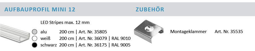 Das besonders schmale Design des Profi LED Einbauprofils Mini 12 ermöglicht den Einsatz in vielen Bereichen. Greifen Sie zu dem schwarzen glänzenden Profil aus pulverbeschichtetem Aluminium für LED Band bis 12 mm, um LED Streifen in Wänden und Decken mit Gips-, Stein- oder Betonplatten zu installieren. Das Einbauprofil ist auch perfekt für den Einbau in Holzverkleidungen und in Möbeln. Sie können es mit der Kabelschleuse TUNNEL ( 35528) kombinieren, um Kabel unauffällig zu verlegen. Dank des hochwertigen Aluminiums leitet das Mini-Profil die Prozesswärme der LED Strips ausgezeichnet ab und schont die Technik der LED Streifen. Durch die milchige flache Abdeckung verschmelzen die Lichtpunkte der LEDs zu einem homogenen Band.
